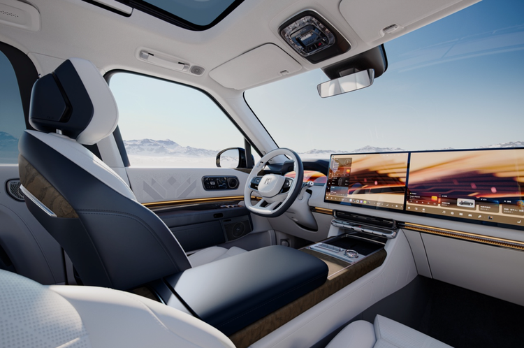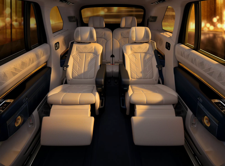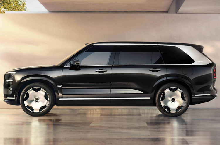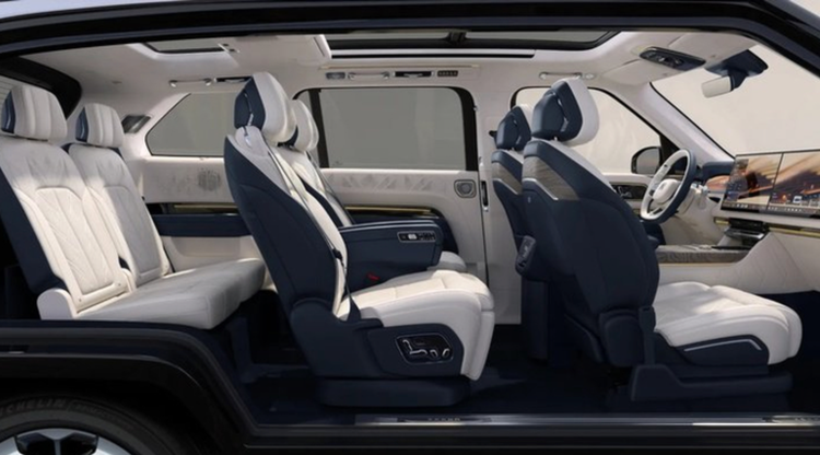 侧面是整车最具辨识度的部分,飞桥游艇式车顶线条流畅舒展,如豪华游艇的飞桥般衔接车顶与车身,勾勒出一体式C环轮廓,不仅拉长了视觉比例,更让车身姿态显得从容优雅。22英寸镜面锻造轮毂质感出众,搭配宽大的车身轮眉,进一步凸显了全尺寸SUV的气场;纯平车门搭配隐藏式水切设计,让车身曲面光滑利落,没有多余装饰却尽显高级,智能电动门支持多种解锁方式,靠近时弹出的迎宾光毯,让每一次上下车都充满仪式感。