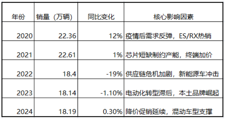 作为丰田旗下的豪华汽车品牌,雷克萨斯早在1995年就进入中国市场,并一直采用纯进口形式进行销售。凭借“日本造、纯进口”的招牌,雷克萨斯在入华之后便迅速崛起,2019年-2021年,雷克萨斯中国市场销售连续三年保持在20万台之上,多款热门燃油车车型在终端市场经常需要加价销售且一车难求。