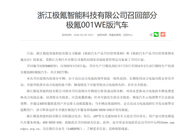 国家市场监督管理总局官网消息显示,从2026年3月6日起,超过3.8万辆 极氪001(参数|询价) WE版汽车将被正式召回。这批生产于2021年7月8日至2024年3月18日期间的新能源汽车,因高压动力电池部件制造一致性问题,甚至可能造成热失控,存在安全隐患。
