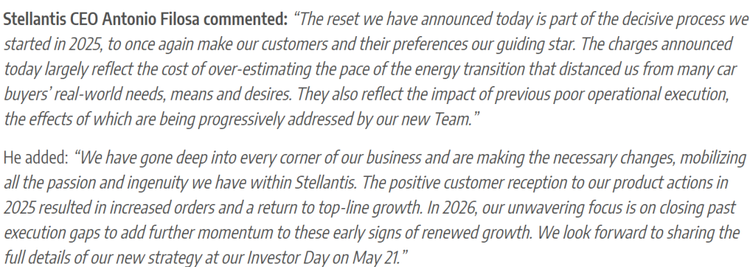 Stellantis CEO 在公告中也直言不讳:「今天公布的费用主要反映的是高估能源转型速度的成本,这使我们与消费者的现实需求、愿望等产生了距离。」