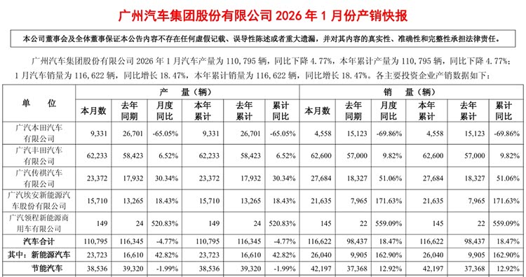 根据广汽集团公开的产销数据可以看出,在刚刚过去的2026年1月份,广汽集团单月销量达到了116622台,同比增长18.47%,其中,新能源汽车月销26040台,同比增长162.9%。从产销快报中不难看出,广汽集团销量回暖的势头比较明显。
