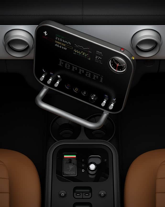 车内一共配了三块屏幕,包括仪表、中控车机屏幕以及后排屏幕。整体风格偏向简约,没有此前法拉利燃油跑车上的异形内饰设计。
