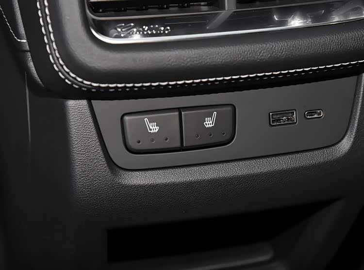 后排空间是凯迪拉克XT5的强项,按照试驾者1.78米的身高调整好前排座椅,腿部有三拳的充裕空间,头顶一拳二指空隙,余地充足。座椅靠背可调角度,坐垫软硬适中,让长途乘坐更舒适。功能性上,豪华型及以上版本增加后排加热,提升了冬季家庭用车的体验,比2025款更显诚意。