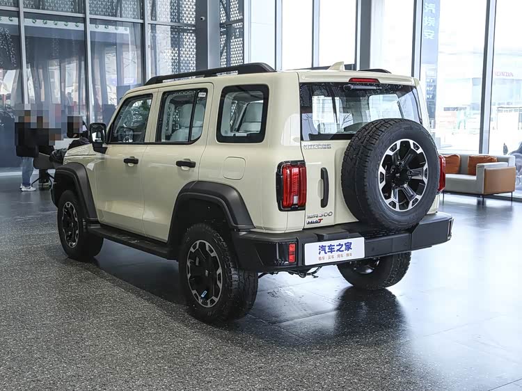 再来看车身侧面部分,车身侧面延续了经典方盒子造型,但通过深沉雅致的腰线与悬浮式车顶设计,弱化了传统越野车的笨重感。4750mm×1930mm×1903mm的车身尺寸与2750mm轴距,在紧凑型SUV中属于主流水平,但19英寸大尺寸厚壁轮胎与外凸式轮眉的搭配,赋予了车辆“小身材大能量”的视觉张力。