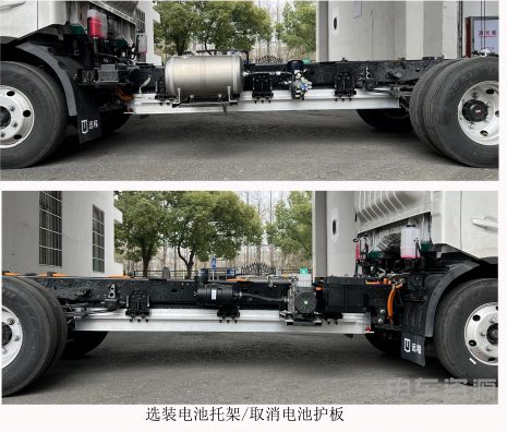 目前超大电量的电池布局大致可以分为几种,坤势底盘的一体化长电池包、比亚迪商用车的两边分包和车架中部悬挂、宇通轻卡的四包电池和单包长条设计。从底盘图来看,远程新能源商用车这款新车采用的是一体化电池包的设计,整体长度较长,可以选装电池托架和电池护板,是比较主流的设计。