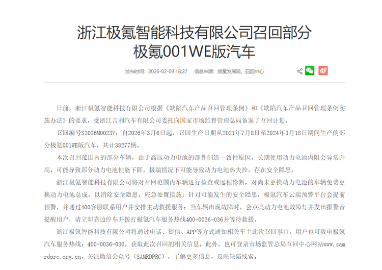 根据召回方案,极氪自2026年3月6日起,召回2021年7月8日至2024年3月18日期间生产的部分 极氪001(参数|询价)WE版汽车,共计38277辆。本次召回范围内的部分车辆,由于高压动力电池的部件制造一致性原因,长期使用动力电池内阻会异常升高,可能导致部分动力电池性能下降,极端情况下可能导致动力电池热失控,存在安全隐患。