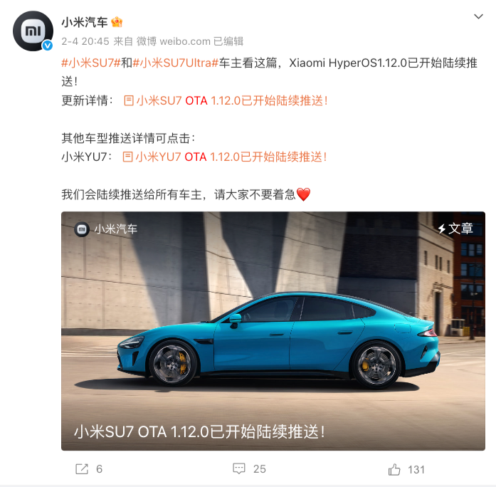 2月4日,小米汽车正式向SU7、SU7 Ultra和YU7推送HyperOS 1.12.0版本,升级核心围绕三点:降低智驾门槛、强化主动安全、优化自动泊车。