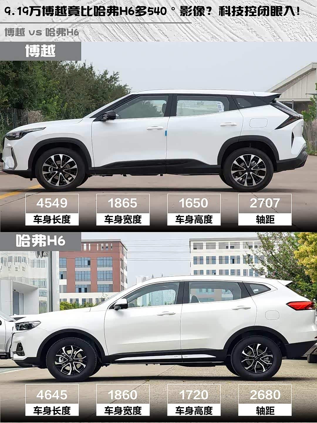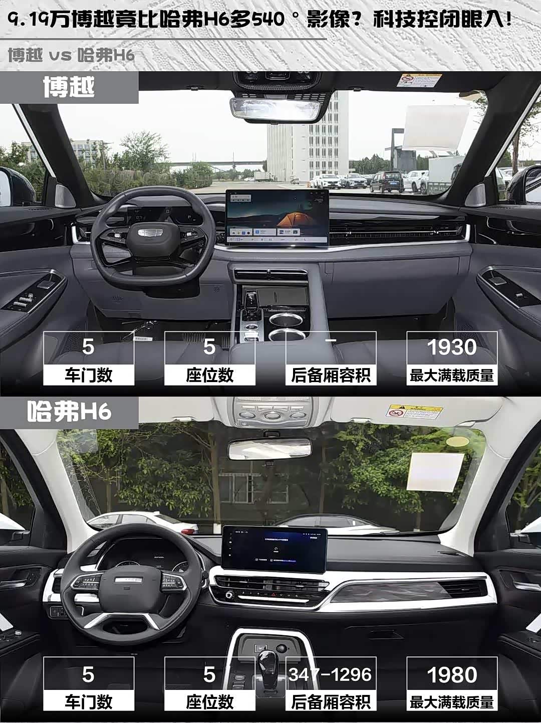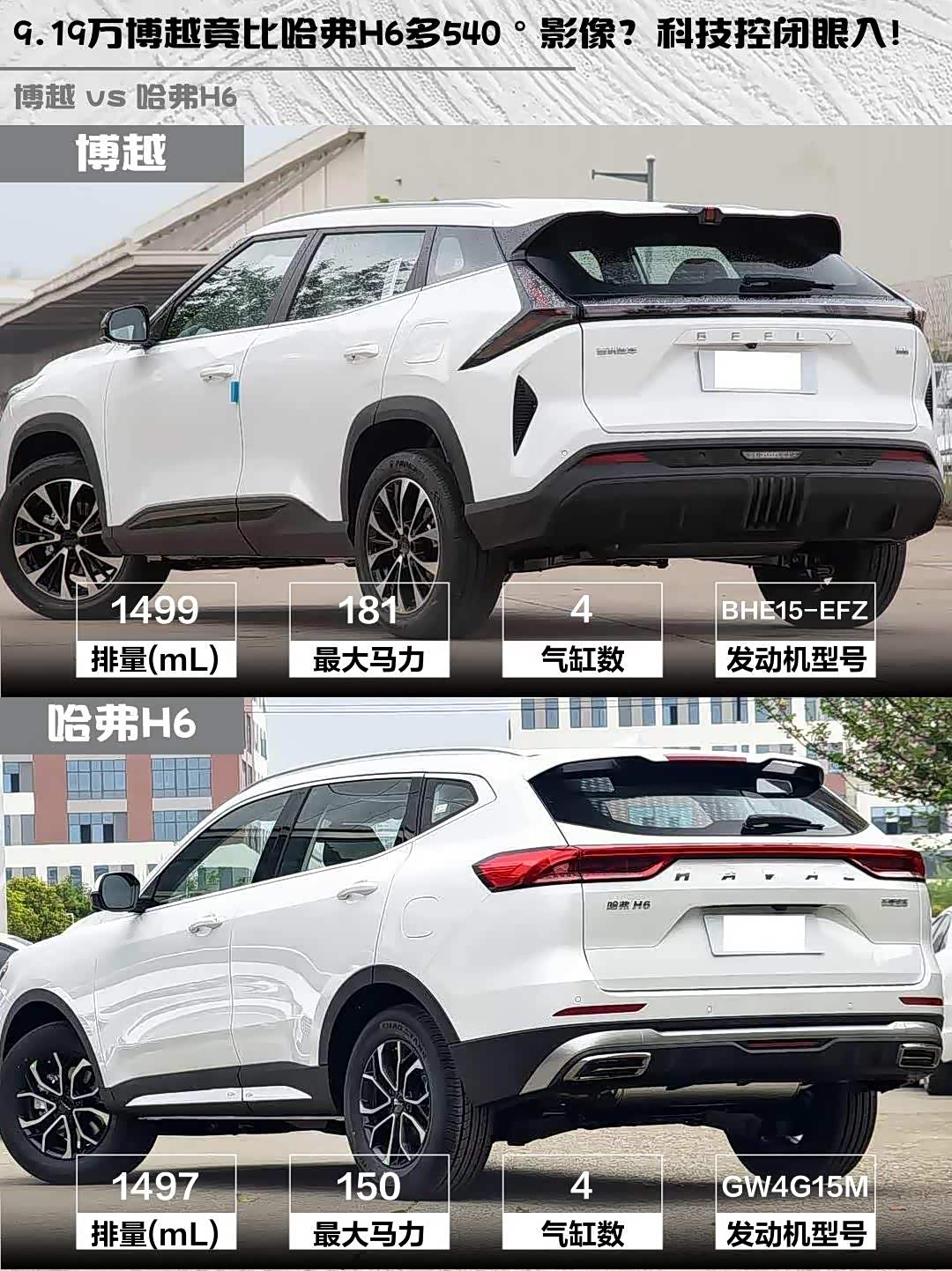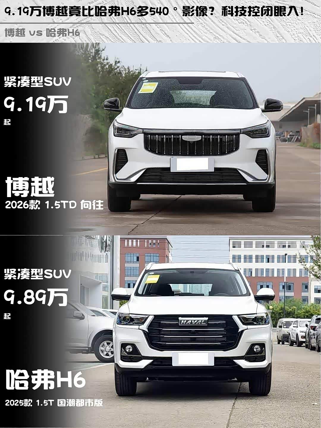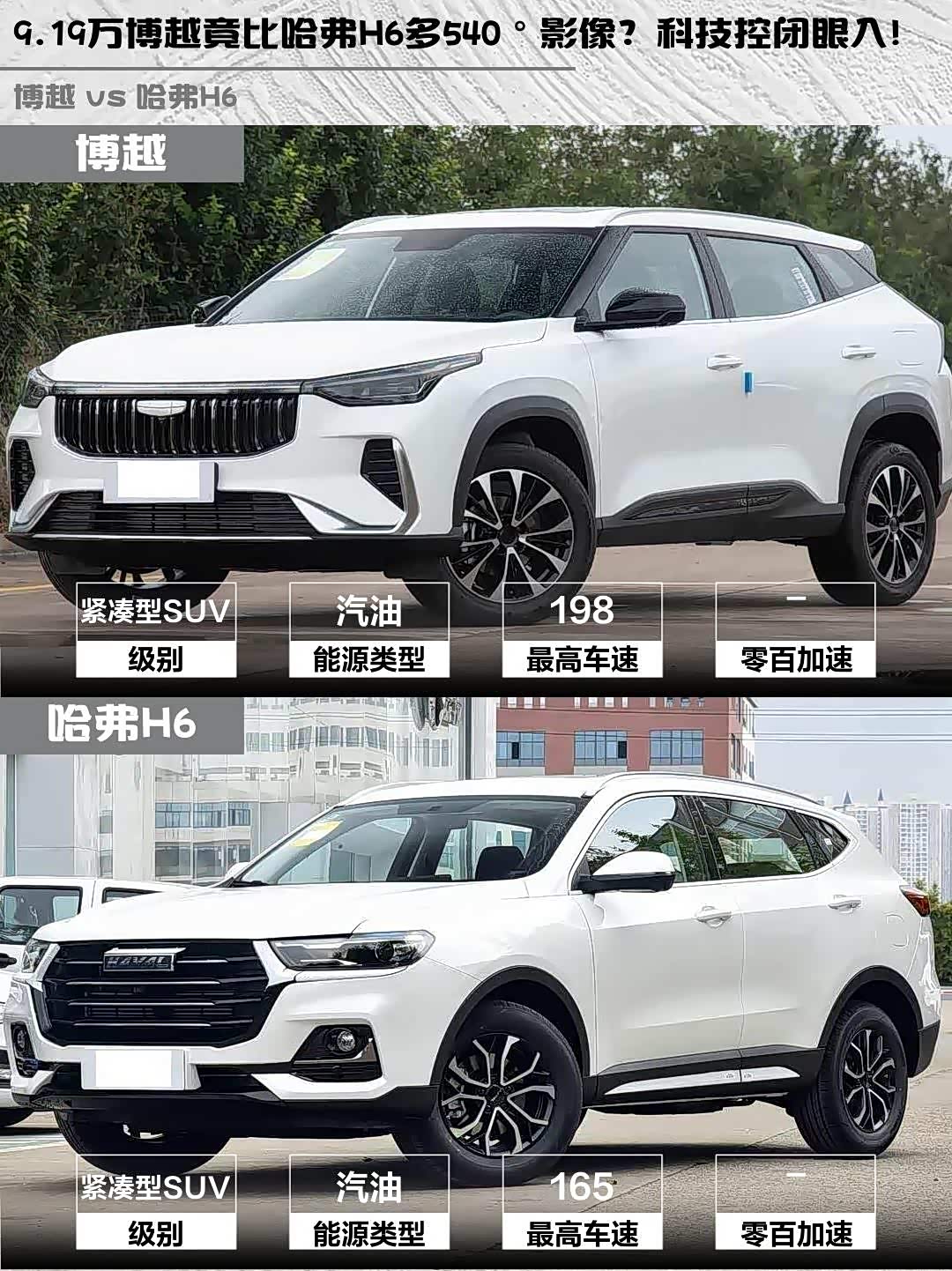 博越指导价9.19万,比H6便宜7千!配置上多出:更大中控屏、更全的语音控制、车窗远程控制。H6优势在于三年/10万公里质保(博越是四年),但油耗更高(WLTC 7.68L)。个人觉得博越的L2辅助驾驶+四气囊更值回票价。