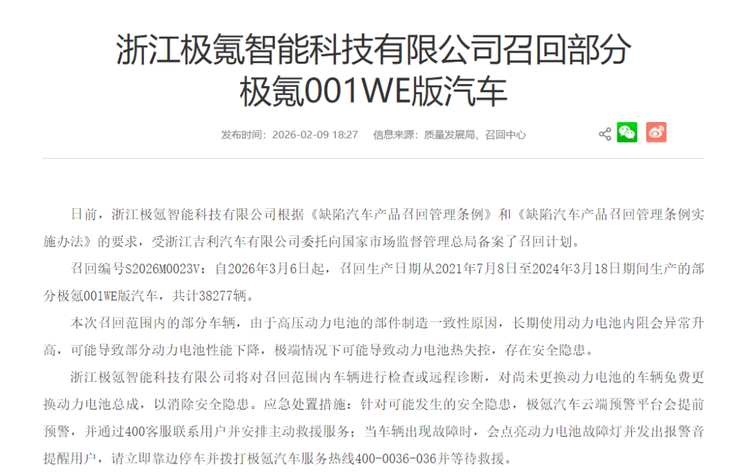 先给大家划重点,这次召回是2026年2月9号刚备案的,从3月6号开始正式实施,涉及的车型很明确——2021年7月到2024年3月之间生产的部分 极氪001(参数|询价) WE版,一共38277辆,划重点:目前在售的极氪全系车型都不涉及,在售车主可以放宽心。