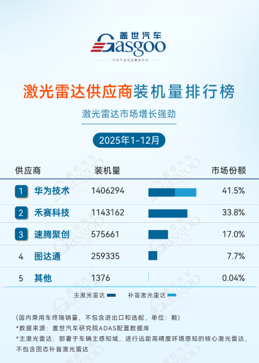 而在2025年1-12月激光雷达供应商装机量排行榜中,华为技术、禾赛科技和速腾聚创三家企业包揽前三名,合计占据了该市场超九成份额。