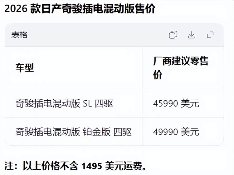 日产在去年秋季发布了 2026 款奇骏插电混动版,如今官方公布其起售价为45990 美元。这一价格比普通版车型高出 16900 美元,而两款车除了名称相同之外,几乎没有其他共同之处。