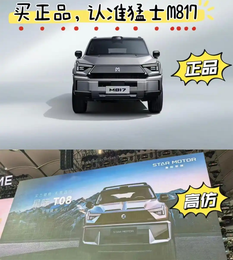有风格近似布加迪威龙的,有看起来很像劳斯莱斯库里南的;有硬派SUV产品看起来很像东风猛士M817、917的,结果还被猛士汽车的高管直接贴出图片对比,将其产品图片打上了“高仿”的字样。