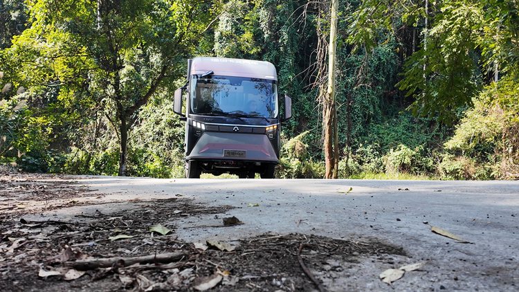 除视野与坐姿的直观优化外,原生纯电平台带来的重心优势更为隐秘且关键。在经过颠簸道路时,坑洼路面未引发车身出现传统高底盘轻卡常见的大幅摇晃现象。低重心设计赋予车辆更优异的行驶稳定性,其循迹性能已接近乘用车水平,大幅提升了复杂路况下的驾驶安全性与舒适性,也降低了驾驶员的操控强度。