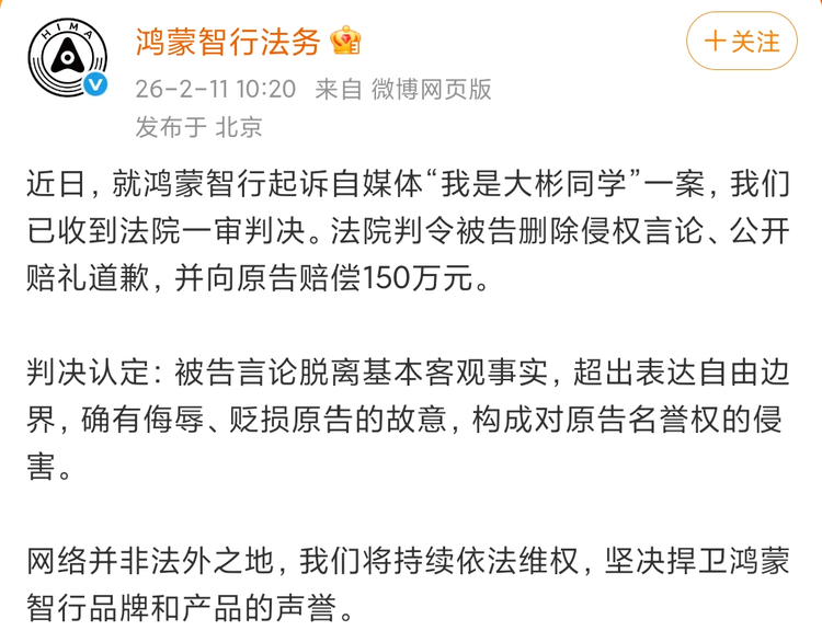 车家号·0浏览·2026-02-11 15:24 · 北京据鸿蒙智行法务发布,就鸿蒙智行起诉自媒体“我是大彬同学”一案,已经收到法院判决。鸿蒙智行法务透露,“法院判令被告删除侵权言论、公开赔礼道歉,并向原告赔偿150万元。判决认定:被告言论脱离基本客观事实,超出表达自由边界,确有侮辱、贬损原告的故意,构成对原告名誉权的侵害。”