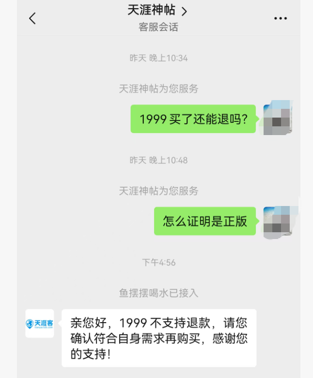 据“天涯客”客服表示,1999元服务包一旦下单,不能退款,提醒确认好需求再下单。