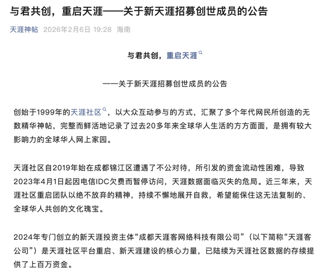 “为确保承载着亿万网民青春记忆、原创内容和人生梦想的宝贵数据完整存续,并推进天涯社区于2026年6月1日恢复访问......招募9999位创世成员,成为新天涯的共建者与天涯社区重启者,共同重构全球华人的精神原乡。”