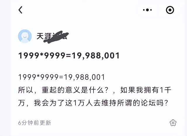 但也有一些网友正在观望,甚至有一些网友表示质疑:“不会是骗子打着天涯的幌子弄的吧?”“重启的意义是什么?如果我拥有1千万,我会为这1万人去维持所谓的论坛吗?”......