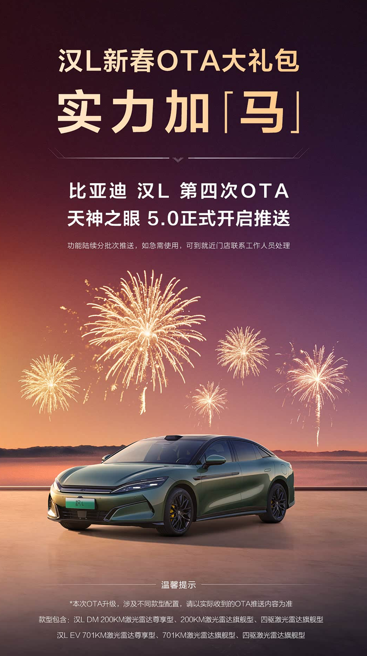车家号·0浏览·2026-02-11 16:01 · 黑龙江2月11日,比亚迪官方宣布,旗下中大型轿车 汉L(参数|询价)正式启动新一轮OTA升级。此次升级涉及29项新增功能与6项功能优化,其中天神之眼5.0版本也随本次推送正式落地。