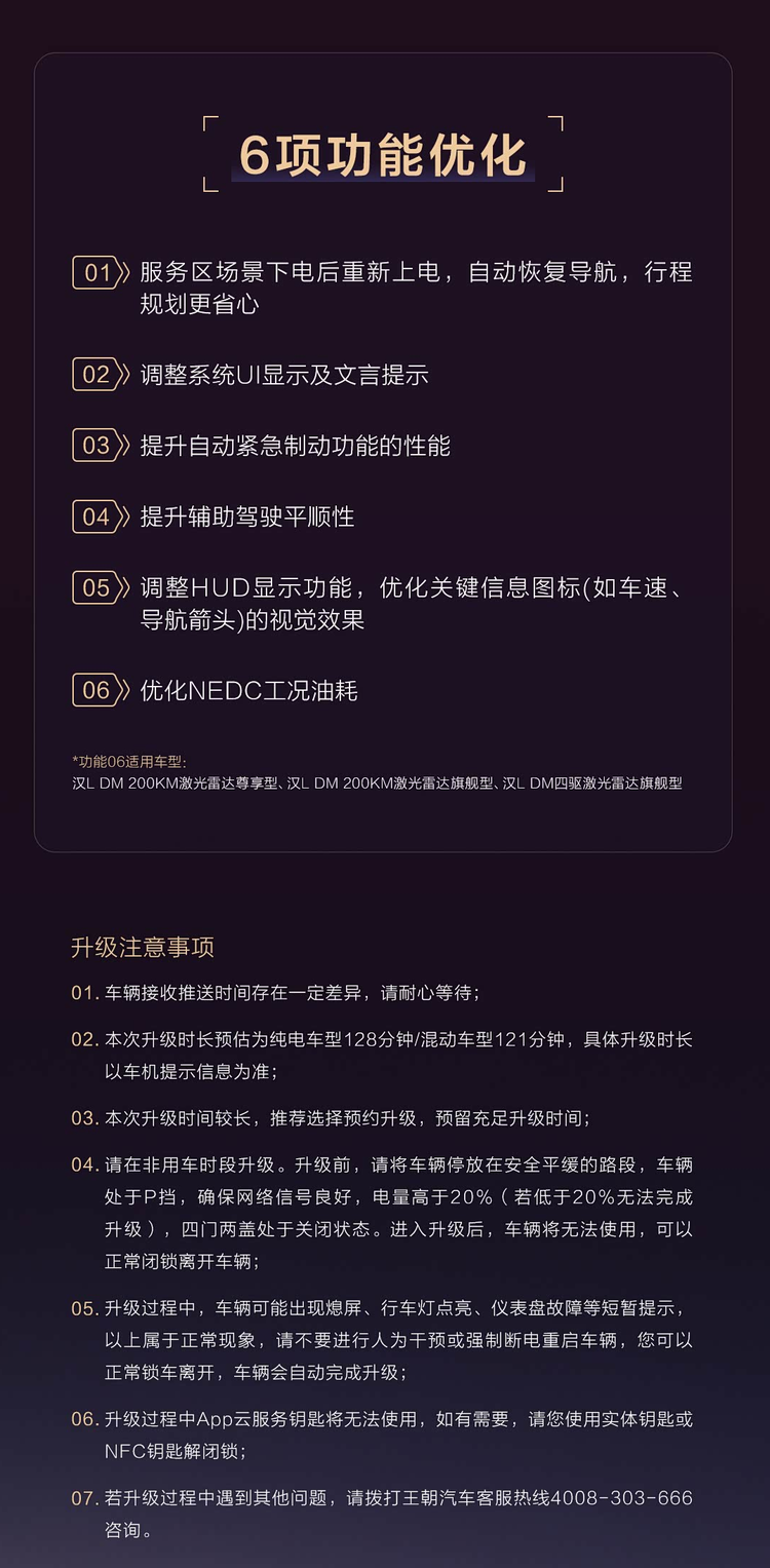 功能优化方面,主要涵盖服务区场景下电后重新上电自动恢复导航、系统UI显示及文言提示调整、自动紧急制动性能提升、辅助驾驶平顺性优化,以及NEDC工况油耗优化。