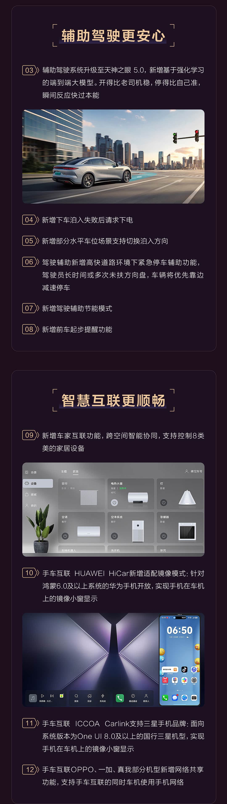 具体新增功能包括:长续航模式、云服务除雪除霜、下车泊入失败后请求下电、部分水平车位场景支持切换泊入方向、高快道路环境下紧急停车辅助、驾驶辅助节能模式、前车起步提醒、车家互联、HUAWEI HiCar适配镜像模式、多款萌宠主题、车生活Agent智能点单、智慧物联软件商城车机密码支付及刷脸支付、用户自定义锁车音效、车载电子木鱼小游戏、HUD账号记忆、Pad空调界面出风颜色显示等。