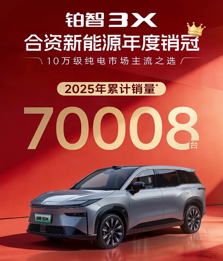 广汽丰田旗下纯电SUV铂智3X,2025年终端销量突破7万辆,稳居合资新能源车型榜首,远超大众ID系列等德系新能源车型,这款售价区间9.48-14.98万左右的车型,凭借贴合用户需求的配置、可靠的三电技术以及厂家推出的电池衰减、自燃等“三担责承诺”,成功跻身10万级纯电主流市场。