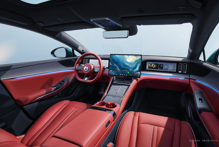 内饰是这次更新的视觉重点。全新的熔岩红配色大面积铺陈,加上碳纤维材质点缀,一体式运动座椅、BOOST竞速拨片、金属怀挡以及三辐式多功能方向盘,把座舱氛围往运动方向进一步推高。空调出风口造型同步调整,并加入镀铬元素强化精致感,整体风格更激进,也更贴近高性能电动轿车的定位。