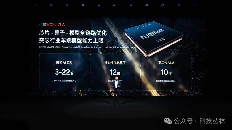 硬件方面,自研的图灵芯片已经上车,单颗算力750TOPS,算力密度和综合效能都要优于双 Orin-X(508 TOPS)方案,专为小鹏VLA定制,接下来所有车型都会换用自研芯片。