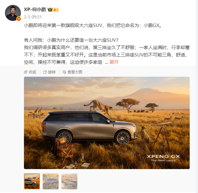 但就在2月初,小鹏汽车创始人何小鹏在社交平台官宣,小鹏将正式进军大六座SUV,第一款旗舰级大六座SUV—— 小鹏GX(参数|询价),预计将于今年4-5月上市。