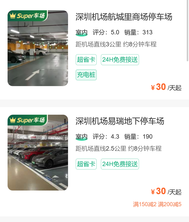 这个经济型的停车方案——停到宝安机场附近的便宜停车场,收费就只要25到30一天,具体看停车场,环境好的、离机场近一点的收费就会贵一些,除了便宜之外,停车场还包接送,往返航站楼也很方便。
