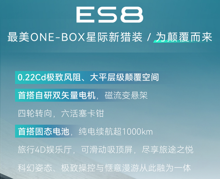 新车将匹配双矢量电机,电机转速可达30000转,0-100km/h加速3秒级,极速260km/h,支持四轮转向,还匹配线控转向技术。续航方面,新车将匹配“固态电池”,搭载800V高压架构,纯电续航里程有望突破1000km。其他配置方面,星途ES8还有望搭载磁流变悬架系统、CDC减震系统等。