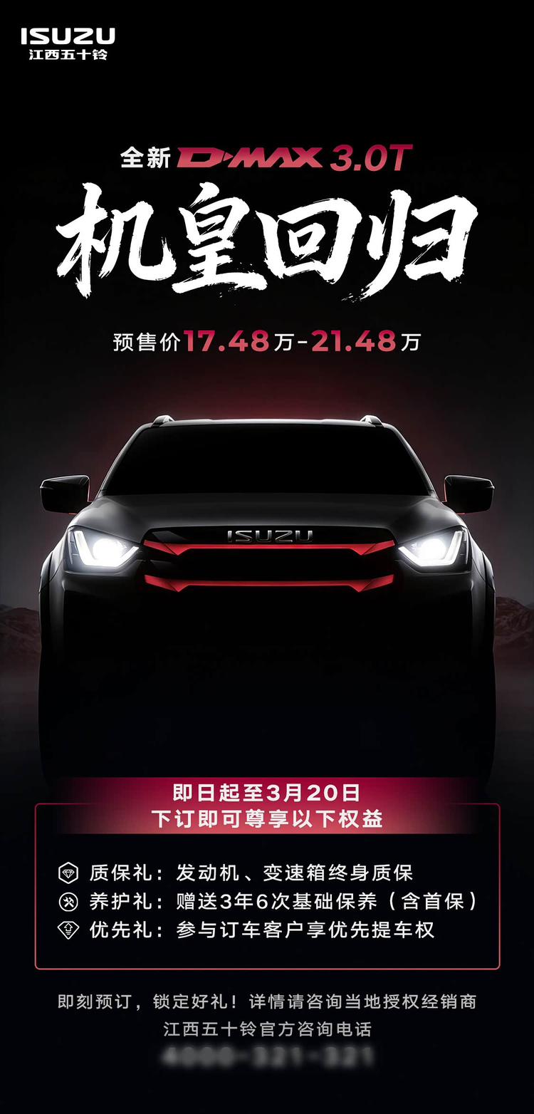 日前,我们从官方渠道了解到,全新五十铃D-MAX 3.0T车型正式启动预售,预售价区间为17.48-21.48万元。预售期间下订的消费者可享受质保礼、养护礼和优先礼三项权益。结合预售截止时间来看,这款新车预计将在3月20日正式推向市场。