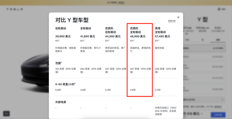 需要说明的一点是,这里的续航,应该是基于美国EPA工况测试的,跟国内的CLTC工况是不太一样的,为了有个直观的对比,我去查了一下特斯拉Model Y北美版的续航,同样是售价在4.8万美元,且座椅为7座布局的特斯拉Model Y,EPA工况下的续航里程为327英里,换算成公里数的话是526km。