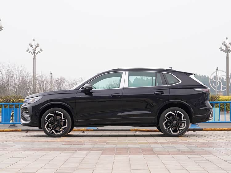 再来看车身侧面部分,车身侧面采用双腰线设计,从机舱盖延伸至A柱的筋线在C柱附近再次浮现,与尾灯相连形成流畅的视觉动线。隐藏式门把手与18/19英寸双色轮圈(R-Line版专属)进一步强化了科技感。车身尺寸为4735×1842×1682mm,轴距2791mm,虽与老款途观L相近,但通过优化轮眉与车底裙边造型,实现了更协调的比例感。