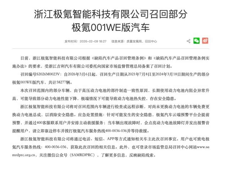 近日,吉利与欣旺达相关纠纷已快速达成和解。与此同时,极氪汽车同步启动旗下部分车型召回工作。本次召回涉及2021年7月8日至2024年3月18日期间生产的部分 极氪001(参数|询价)WE版汽车,共计38,277辆,召回自2026年3月6日起正式实施。