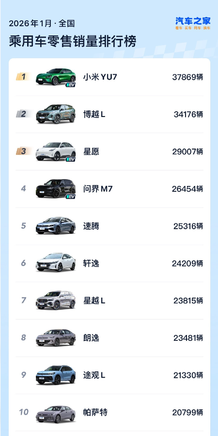 1月份车市销量榜当中,从数量上,前10名里新能源车型只有3款,分别是卖了37869辆的小米YU7、卖了29007辆的吉利星愿、以及卖了26454辆的问界M7。但是,从排名和销量统计上,新能源无疑实现了质的突破。