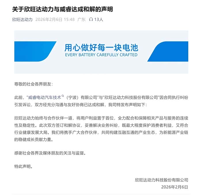 2026年开年,碳酸锂价格较2025年初上涨超150%,镍、钴供应国主动减产推高原材料价格,一辆中型电动车仅铜、铝成本三个月就增加1800元。在这一轮成本的绞杀中,整车厂与电池供应商之间的关系变得空前微妙。2月6日,欣旺达一纸23.14亿元天价诉讼的和解公告,将这种紧绷状态撕开了一道口子。