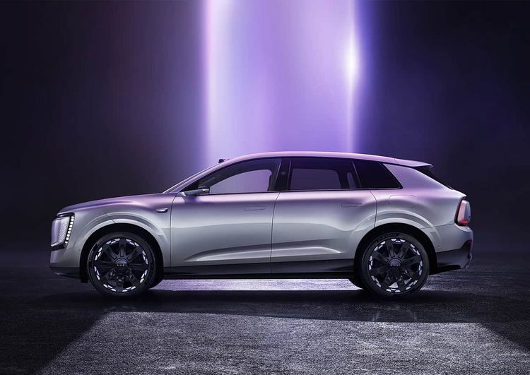车身侧面可见车顶位置布置有激光雷达模块,外后视镜采用电子流媒体形式。根据申报资料,用户亦可选择传统光学外后视镜。前翼子板处安装有环境感知摄像头,与车顶激光雷达形成硬件组合,这套感知系统针对中国道路环境进行了适配优化。轮眉区域采用外扩设计,塑造出宽体视觉效果。轮毂为8辐条造型,尺寸达到22英寸,申报信息显示还将提供另外三种样式及21英寸规格可选。