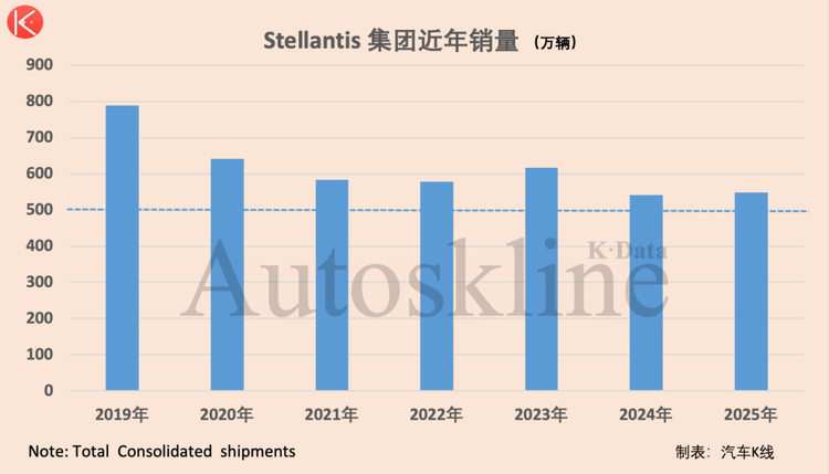Stellantis集团官方预计,该公司2025年销量约为548万辆,与上年持平。而在最初合并,其年销量一度接近800万辆。