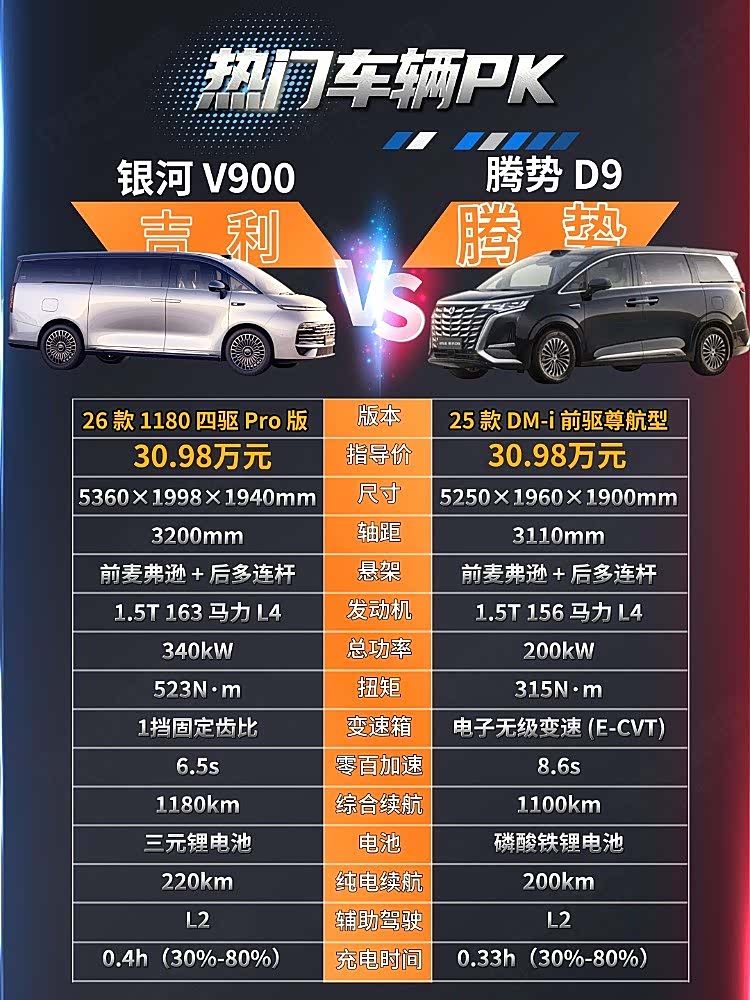 吉利银河V900 2026款1180四驱Pro版售价为30.98万元,而腾势D9 2025款DM-i两驱尊航型售价为30.98万元,两款车售价一致,那么哪一款车更值得入手呢?