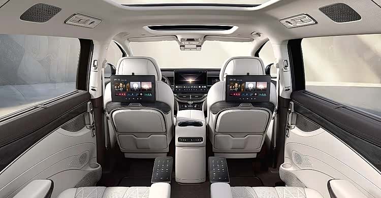 六音区语音识别控制系统可精准识别各位置乘客指令,实现对多媒体、导航、空调等功能的语音控制。车辆还配备了双头枕屏,可为后排乘客提供独立影音娱乐体验。