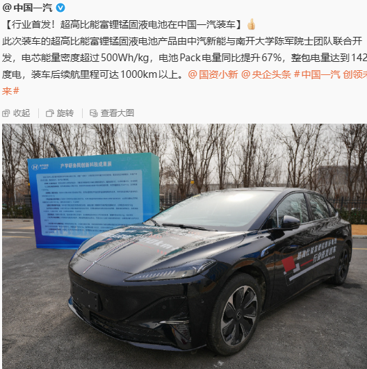 就在近期,一汽集团官方账号发布了一则重大消息,那就是旗下的超高比能富锂锰固液电池在行业内首先实现了正式装车。为了方便记忆,我们直接将其形容成一汽固液电池,其实该电池的名称我认为非常准确。
