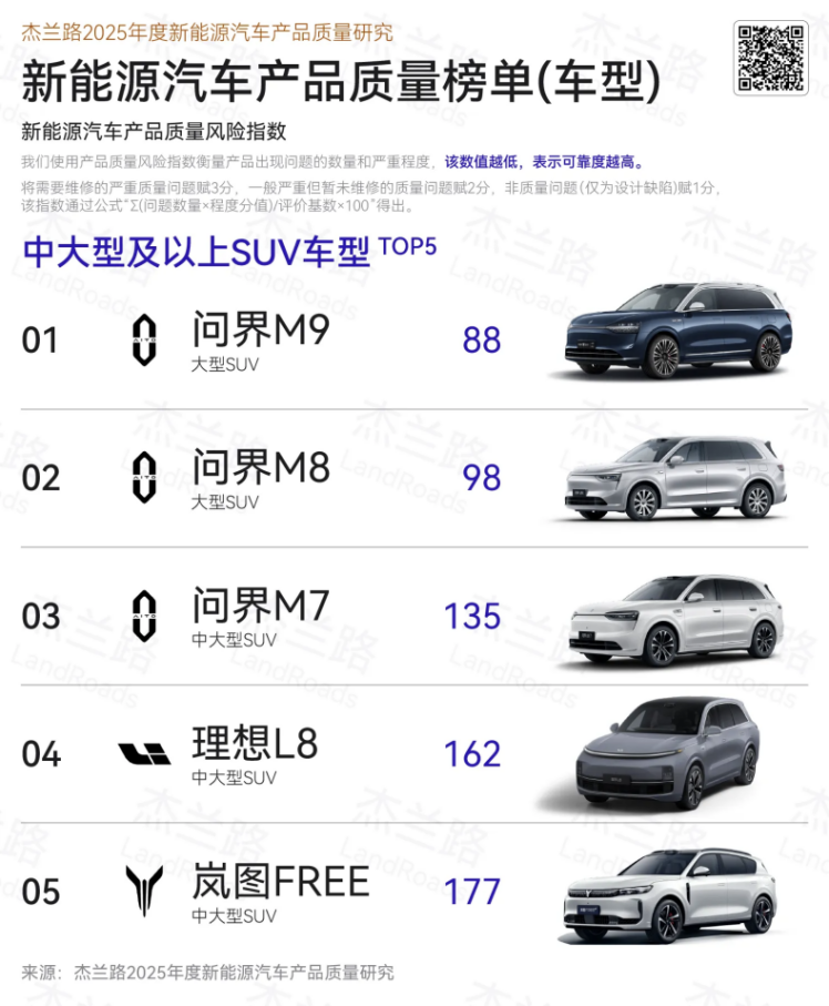 买车不只看产品本身,为了避开选购误区、少踩坑,不少人都会参考市场口碑,跟着主流选择入手,这样一来更稳妥也更放心。问界M8已累计交付超过15万辆,稳稳占据40万级销量标杆。在《2025下半年新能源汽车品牌健康研究报告》中,首次参评位列车型NPS(净推荐值) 第二;而且在杰兰路《2025年度新能源汽车产品质量研究报告》中,问界M8在新能源汽车产品质量榜单(车型)中获得第二名的好成绩。问界M8销量与口碑双在线,跟着市场选择,买车更有保障。