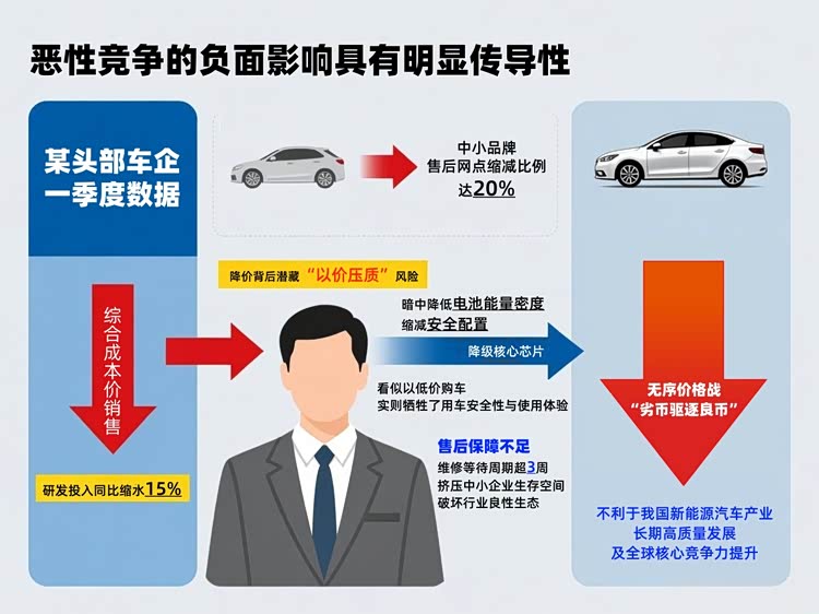 恶性竞争的负面影响具有明显传导性,表面上受损的是车企自身,最终将波及消费者与整个新能源汽车行业。对车企而言,持续低于综合成本价销售会大幅压缩研发投入空间,某头部车企一季度研发投入同比缩水15%,部分中小品牌售后网点缩减比例达20%;长期来看,自动驾驶、固态电池等前沿技术的研发进程将被搁置,行业技术进步陷入停滞。对消费者而言,降价背后可能潜藏“以价压质”的风险:部分车企为压缩成本,暗中降低电池能量密度、缩减安全配置、降级核心芯片,消费者看似以低价购车,实则牺牲了用车安全性与使用体验,后续还可能面临售后保障不足、维修等待周期超3周等问题。对整个行业而言,无序价格战将扭曲市场竞争机制,引发“劣币驱逐良币”现象,挤压中小企业生存空间、破坏行业良性生态,不利于我国新能源汽车产业长期高质量发展及全球核心竞争力提升。
