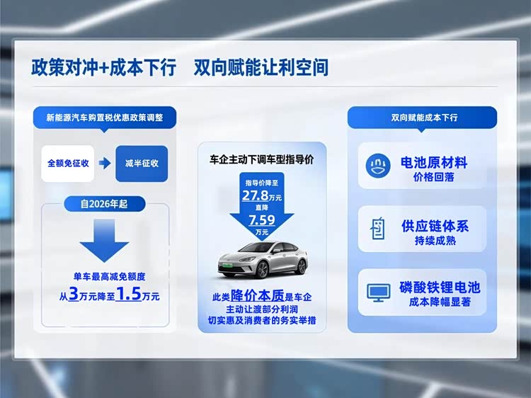 第一种合理让利模式,源于政策对冲与生产成本下行的双重利好。自2026年起,新能源汽车购置税优惠政策从全额免征调整为减半征收,单车最高减免额度从3万元降至1.5万元。为对冲政策调整带来的消费者购车成本上升压力,多家车企主动下调车型指导价,推动产品定价回归市场合理区间。以某纯电动车型为例,其最低指导价降至27.8万元,较此前直降7.59万元,此类降价本质是车企主动让渡部分利润,切实惠及消费者的务实举措。与此同时,随着电池原材料价格回落、供应链体系持续成熟,新能源车生产成本逐年下行,其中磷酸铁锂电池成本降幅最为显著,这也为车企实施降价策略提供了充足空间。基于生产成本下行的降价,既不会损害企业自身发展根基,也能让消费者以更低成本购置车型,实现行业与消费者的双向共赢。