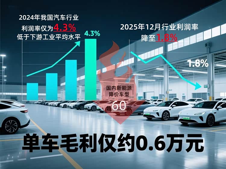 目前,恶性竞争的苗头在行业内已逐步显现。相关数据显示,2024年我国汽车行业利润率仅为4.3%,低于下游工业平均水平;2025年前4个月,国内新能源降价车型超60款,进一步挤压企业利润空间,2025年12月行业利润率更是降至1.8%,单车毛利仅约0.6万元。部分中小车企为抢占市场份额,陷入“同质化降价比拼”的恶性循环,甚至出现“亏损换量”的极端情况——某新势力品牌每销售一辆车型便亏损2万元,最终导致供应链工厂停工维权,此类自杀式降价,正是恶性竞争的典型体现。