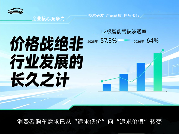 对于车企而言,更应清醒认识到:价格战绝非行业发展的长久之计。当前,我国新能源汽车产业已进入从规模扩张向质量效益转型的关键爬坡期,单纯依靠低价抢占市场的模式已不符合行业发展趋势。消费者购车需求已从“追求低价”向“追求价值”转变——L2级智能驾驶渗透率从2025年的57.3%快速攀升至2026年的64%,这一数据充分印证了这一趋势。企业的核心竞争力,不在于产品价格高低,而在于核心技术研发实力、产品品质把控能力及售后服务完善水平。比亚迪董事长王传福曾表示,“良性竞争应比技术比服务不是比谁赔得多”,这一观点精准契合了新能源汽车行业的发展本质。
