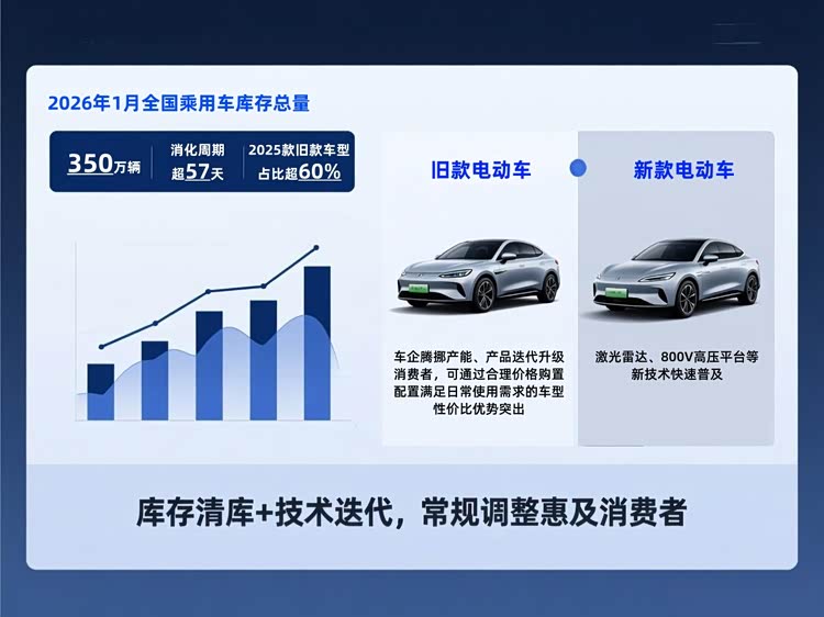 第二种合理让利模式,是车企应对库存清库与技术迭代的正常市场调整。据行业统计,截至2026年1月初,全国乘用车库存总量达350万辆,库存消化周期超57天,其中2025款旧款车型占比超60%。加之7月电池新国标即将正式实施,未达标的旧款电动车将面临停售风险,这一现状倒逼经销商加快库存清库节奏。旧款车型降价销售,是车企腾挪产能、推进产品迭代升级的常规操作,对消费者而言,可通过合理价格购置配置满足日常使用需求的车型,性价比优势突出。此外,激光雷达、800V高压平台等新技术快速普及,使得搭载旧款技术的车型市场吸引力持续下滑,此类车型降价是市场选择的必然结果,与恶性竞争无直接关联。
