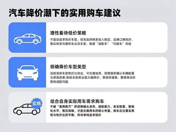结合此次降价潮与行业现状,为持币待购消费者提供三点实用购车建议: