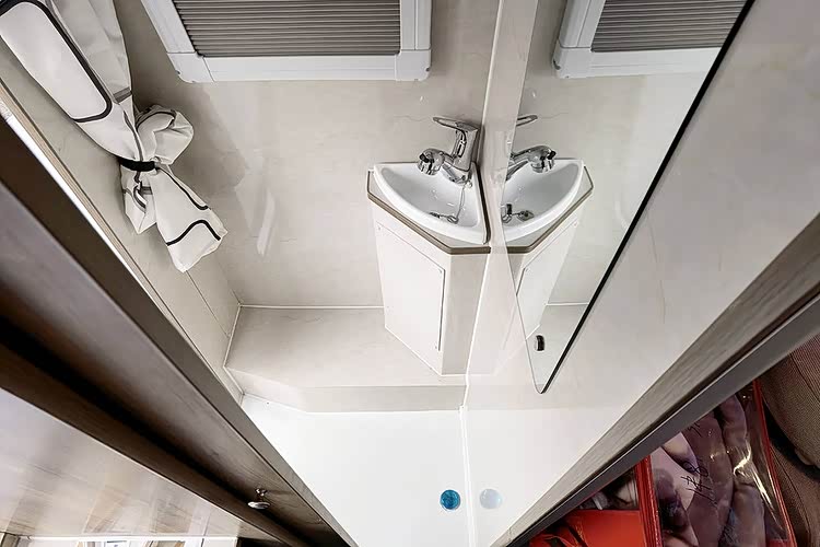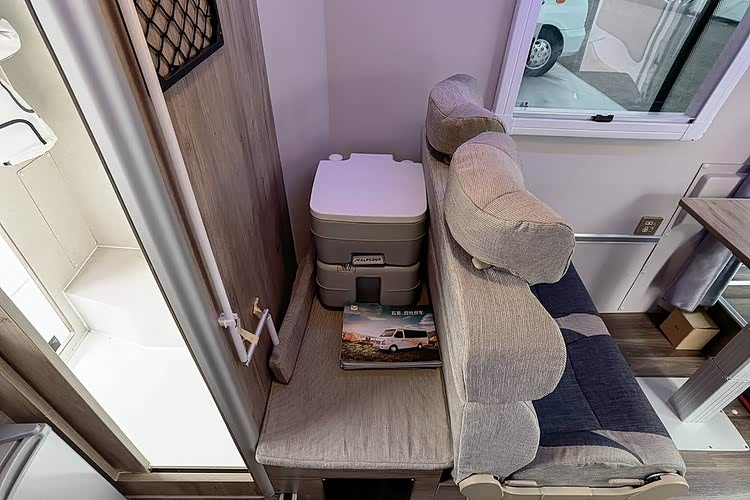 厨房位于车尾左侧,洗涮间则位于车尾右侧,配备了抽拉式淋浴花洒(兼水龙头)、便携式马桶、洗漱镜和30cm镜柜收纳柜,可以用来盛放洗漱用品。