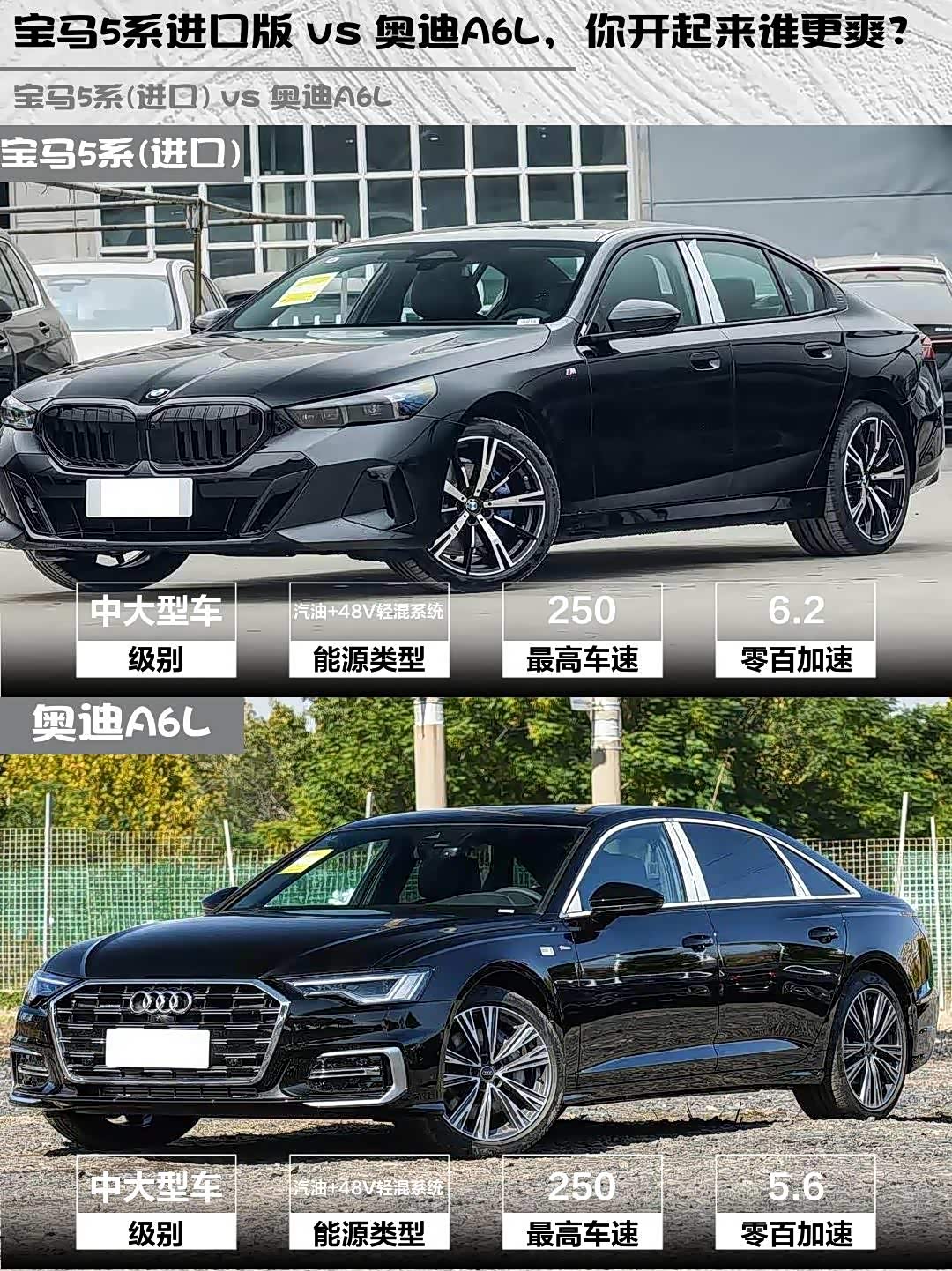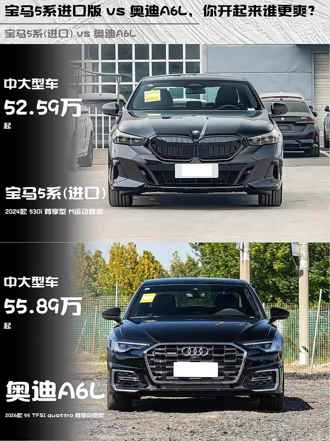 最近在纠结 宝马5系(进口)(参数|询价) 2024款 530i 尊享型 M运动套装和奥迪A6L 2026款 55 TFSI quattro 尊享动感型的朋友看过来!作为深度体验过两台车的"老司机",来聊聊这两台德系豪华轿车的真实差异🔥